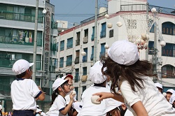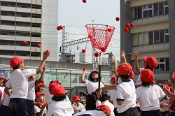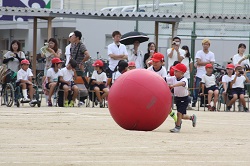 低学年の大玉ころがしと玉入れのようすです。かごをめがけて一生懸命、玉を投げる姿が印象的でした。