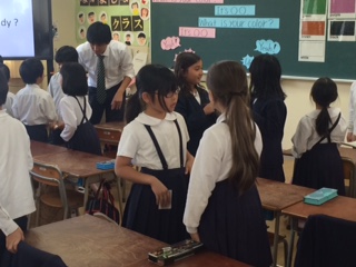 例えば象はgray(灰色)、リンゴはred(赤色)というように絵を見て、何色か英語で言いました。その後は自分と同じ色のカードを持っている友だちを見つけていくゲームをしました。同じ色を持っていたらハイタッチ、違っていればUh-huh!と残念な表情をするというように、楽しみながらいろんな色を英語で言うことができました。