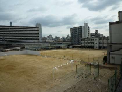 12月に入り、調査等も終わり、いよいよ本格的な工事が始まりました。先週、体育館と格技室の間に、プレハブの事務所が建てられました。そして、今週より仮囲いの組み立てが開始され、17日現在の運動場の状況は、下の写真のとおりです。約1年はこのような状態が続くようです。