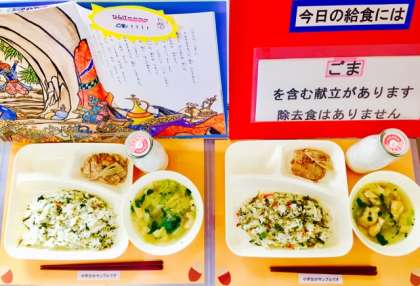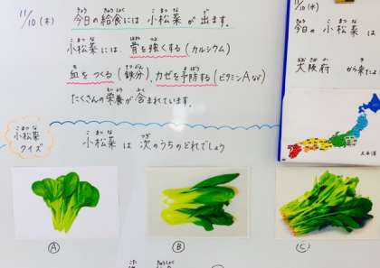 小松菜とじゃこの混ぜご飯は、旬の小松菜と風味の良いじゃこを組み合わせた栄養たっぷりの混ぜご飯です。小松菜を細かく刻んで調理することで野菜が苦手な子どもたちにも食べやすい献立になっています。