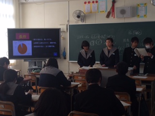 9年生の理科の学習のようすです。水力発電や火力発電など、仕組みやメリット・デメリットについて各班で調べたことを、発表しました。調べていく中で、どの発電にもメリット・デメリットがあることが分かりました。そして、どのように電気を使っていくべきかについても、考えることができました。