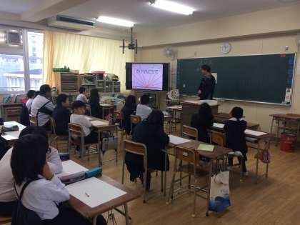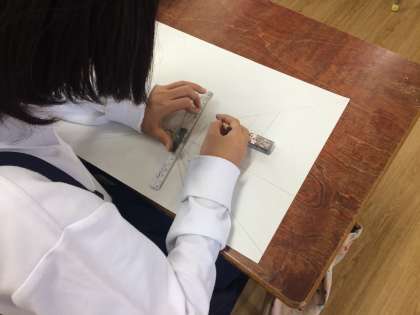 5年生の図工の学習のようすです。今日は遠近法を使って絵を描く練習をしました。電子黒板に補助線のひき方を示したのちに、実際に奥行きがある道と立体感のあるビルを描いていきました。子どもたちも先生の指示をよく聞き、真似ていくことで、奥行きのある風景を描くことができました。