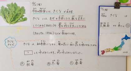 菊菜と白菜の胡麻和えは今が旬の菊菜と白菜をさっと塩ゆでしてから胡麻和えにしています。彩もよく、食べやすい献立です。