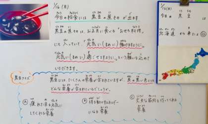 黒豆の煮物は乾燥した黒豆をお湯に浸けて柔らかく戻してから、柔らかくなるまで煮て砂糖と塩、濃い口しょうゆで味付けしています。他の献立とも合うように、甘さを控えて食べやすく仕上げています。