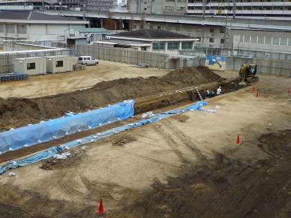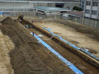昨日から、校舎建設予定のグランドを、ショベルカーで掘る作業が始まりました。最初は新校舎の基礎の工事かなと思っていたのですが、どうやら遺跡の発掘作業のようです。