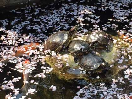 今日、のぞいてみると、亀が甲羅干しをしているのですが、その上に桜の花びらが乗っていて、ちょっとおしゃれなカメになっていました。
