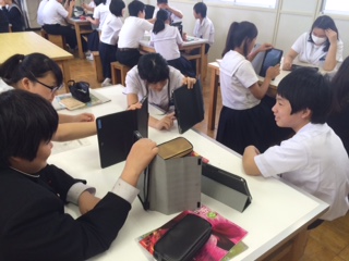 8年生の美術の学習のようすです。これから版画の学習を進めていきます。その準備として、タブレットで自画像を撮影しました。次時の学習では、写真を白黒反転させて、版画の学習に活用していきます。