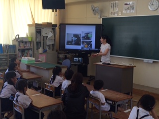 5月18日(木)、1年生が松之宮小学校の楠田先生に栄養指導をしていただきました。今回のテーマは「給食」でした。毎日の給食は誰が作っているのか、どれくらいの量を作っているのかなどを分かりやすく教えていただきました。