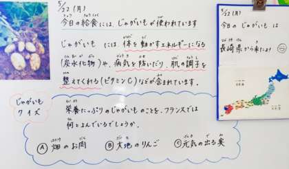 ジャガイモのミートグラタンは薄く切ったジャガイモとひき肉、玉ねぎをたっぷりと使い、ケチャップなどで味付けし、1クラス分ずつオーブンで焼き上げています。