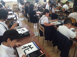 5年生の学習のようすです。習字の学習で「花」という字を書きました。「とめ」「はね」「はらい」や形に気をつけて、半紙に「花」を書いていきました。