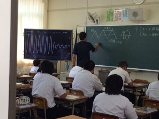 7年生の理科の学習のようすです。音の波形を見て、そこから何が分かるかのかを学習していました。振幅が大きくなると大きな音に、振動数が大きくなると高い音になることを理解しました。