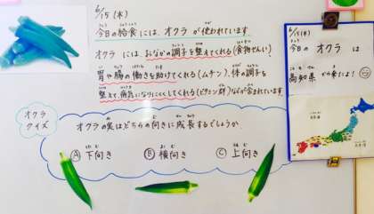 給食掲示のコーナーでは、オクラの成長する向きについてのクイズを出しました。「図書館で調べたらわかるんちがう?」と言って調べに行く子どもたちもいました。