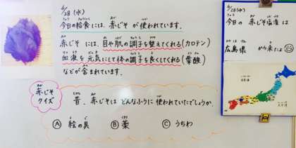 キャベツの赤紫蘇和えは塩ゆでしたキャベツに赤紫蘇(塩漬け乾燥品)と砂糖、薄口しょうゆを使って味付けしています。赤紫蘇の香りには気分を穏やかにする成分が含まれています。落ち着いた気持ちで午後からも頑張ってもらいたいです。
