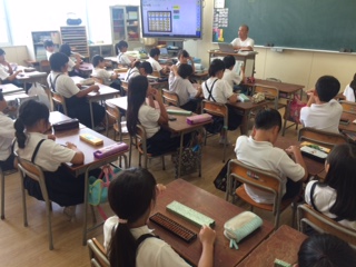 4年生の算数の学習のようすです。そろばんを使って、たまをはじいたり、簡単な計算をしました。慣れない手つきで計算問題に取り組んでいました。