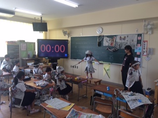 2年生の図工の学習のようすです。「新聞紙となかよくなろう」というテーマで活動しました。新聞紙をまるめたり、ねじったり、ひきさいたりして、体に身につけていきました。完成した作品は、みんなの前で披露して、楽しみました。