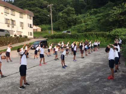 林間学習2日目は、6時起床。ラジオ体操を行いました。天気も良く、ハイキングが楽しみです。