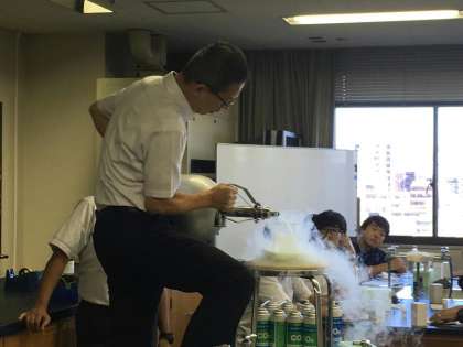 簡易カメラの製作、液体窒素を使った様々な実験を行いました。中学校の理科の先生方は生徒の気分になって実験に参加し、「お〜」とか「すごい」と声を上げていました。