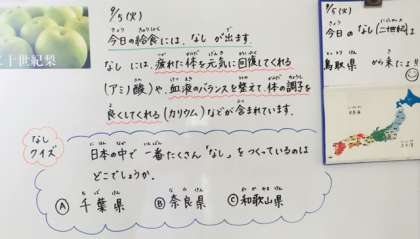 今日、3年生の教室では「やったー!梨や!」「めっちゃすき!」という声が聞こえてきました。旬の果物には栄養がたっぷり入っているお話をすると「家でも食べるわ!」と笑顔で話してくれる子もいました。