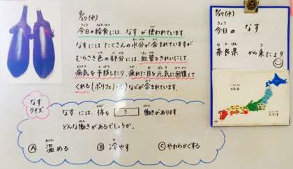子どもたちが嫌いな野菜の上位に入る「ナス」ですが、今日の献立ではナスと味噌の風味がよく合い、食べやすかったようです。どのクラスでもよく食べてくれていました。