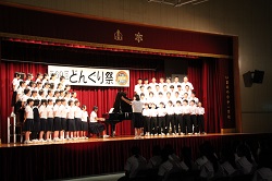 写真は7年生の舞台のようすです。「つみきのいえ」の群読と「マイバラード」の三部合唱を披露しました。中学生になって初めてのどんぐり祭でしたが、不安や緊張を見せることなく、しっかりと自分の役割を果たしました。