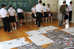 午後からは各学年及び各教科の展示を鑑賞しました。7年生は一泊移住でスケッチした風景画、8年生は校区のジオラマを作製、9年生は一文字砂絵です。
