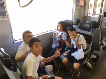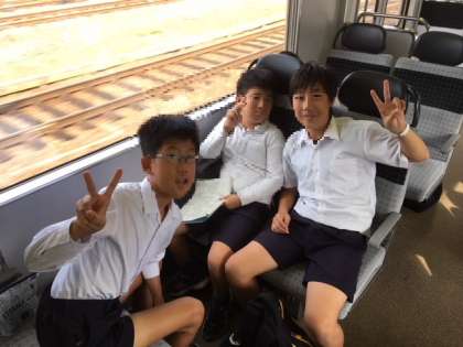 大阪を離れ、およそ4時間。予定通りの時刻に賢島駅に着きました。天気にも恵まれ、絶好の修学旅行日和となりました。電車内ではグループで楽しく活動しました。