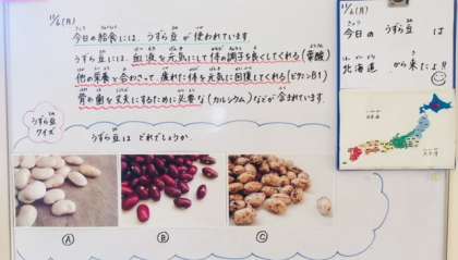 3年生の教室ではうずら豆を食べながら「うずら卵に似てるかなぁ?」と一粒ずつ眺めながら食べている子もいました。いろいろなことに興味を持ちながら給食を食べてくれると嬉しいです。