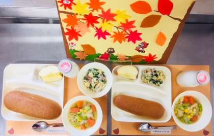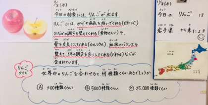 5年生の教室ではりんごの種類について知っている名前をいろいろと教えてくれる子もいました。「ふじ!」「つがる!」「サンふじ!」次々と出てくる名前に驚かされました。今日の給食のりんごは濃い赤色が特徴的な「秋映」でした。