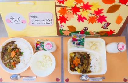 今日のビーフカレーライスには、小学生にも中学生にも大人気の「ラッキーにんじん」が入っています。楽しい給食の時間を過ごしてほしいと思います。