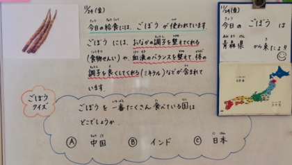 一年生の教室では、きんぴらごぼうが大人気でした。よく噛んで食べることは脳を刺激し、活発化したり、身体の発育にも関係したりする大切なことです。おいしさを味わいながらしっかりと噛む習慣をつけてほしいと思います。