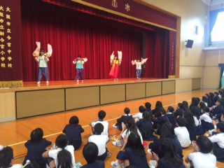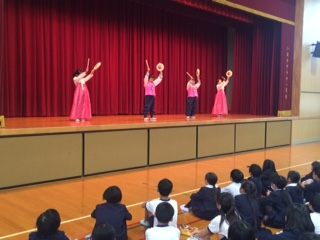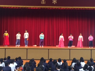 12月4日(月)、「テナムの会」に参加している8名の児童が体育館で日頃の取組みを紹介してくれました。民族衣装のチョゴリを着て、踊りを披露しました。最後に一人ひとりが1年間の取組みで思い出に残ったことを発表しました。