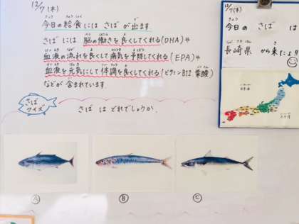 今日の掲示は「鯖はどれでしょうか?」です。鯖は切り身で見ることが多いので、少し難しかったようですが、みんなで楽しく考えてくれました。