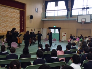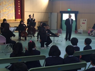 12月9日(土)、土曜授業で芸術鑑賞を行いました。前半は1〜4年生、後半は5〜9年生に分けて行いました。本年度は音楽鑑賞で「シャイニー・アーツ・アンサンブル」を招き、素晴らしい演奏を聴くことができました。鑑賞の中で、児童生徒がヴァイオリンやシンバルなどを演奏する機会も作ってくださいました。皆さんが奏でる素敵なメロディーに自然と手や足でリズムをとる子もいました。本当に素敵な音楽鑑賞となりました。
