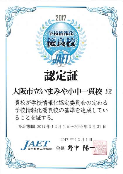 このたび、日本教育工学協会(JAET)による学校情報化優良校に認定されました。