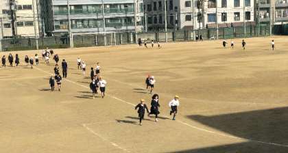 休み時間に、これまではサッカーが多かったのですが、そのトラックに合わせて、みんな走っています。一緒に走っている担任の先生もおられます。