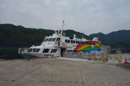 5月14日水曜、早朝、みんな元気に集合して、バスで境港に。正午直前に高速船は爆音を響かせて出港。(写真上)