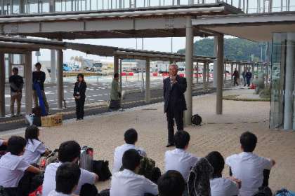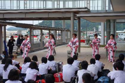 一時間半ほどで隠岐の島で最大の島後の西郷港に到着。そこでは町を挙げての歓迎で、民謡しげさ節(写真中)が披露されたり、町長さん直々のあいさつ(写真下)があったりと大歓迎。