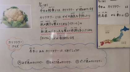 子どもたちには「カリフラワーには、いろんな色や種類があるんだよ。」といってカラフルなカリフラワーの写真を見せると、「えー!すごい色!」と驚いていました。中には「全種類食べてみたいな!」「どうやったらこんな色になるのかな?」など、いろんな方向に興味津々でしたl。