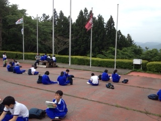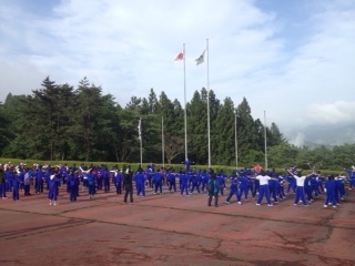 写真中央は朝の集いのラジオ体操。みんな元気に体を動かしていました。