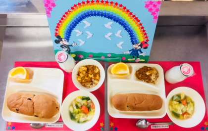 豆腐のミートグラタンは牛ひき肉、豚ひき肉、野菜をたっぷり使ってミートソースを作り、豆腐を加えて煮、一クラス分ずつバットに入れて焼き上げています。子どもたちに大人気の献立です。
