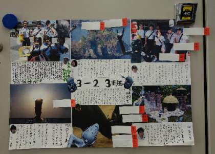 今、職員室で修学旅行の写真コンテストが行われています。生徒が撮影した写真とコメントが班ごとにまとめられていて、その中から教職員が選んで付箋を貼っていきます。
