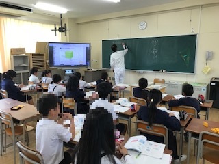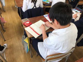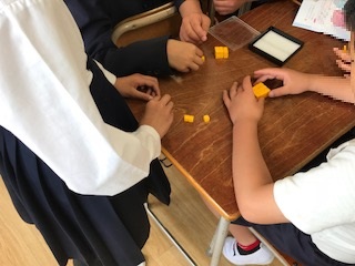 5年生の算数の学習のようすです。今回は直方体の体積の求め方を考えました。例えば、体積が24㎤になる直方体の形を1㎤のブロックを使って考えていきました。その後、出来上がった形に式を当てはめていきました。実際にブロックを使うことで、視覚的に分かりやすく、答えを導き出すことができました。