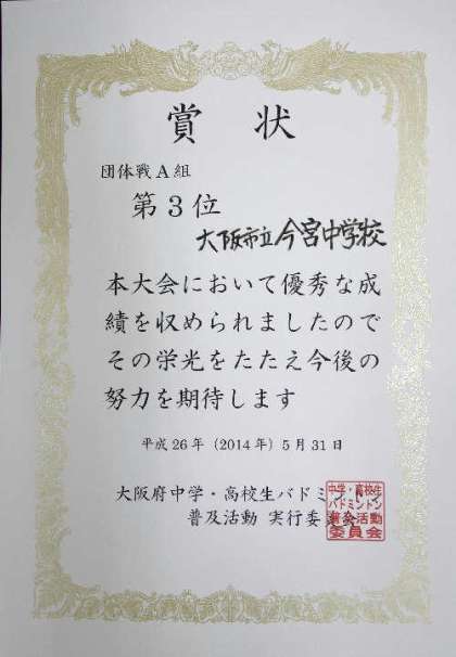 はじめに、府中学・高校生バドミントン普及活動実行委員会主催の大会で団体A組が3位になったので、賞状を伝達しました。