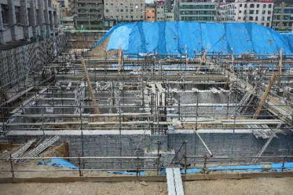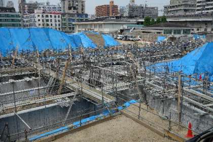先週末の基礎のコンクリートが固まったようで、周りの足場などを撤去しています。