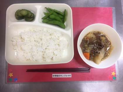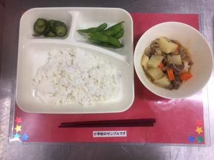 今日の給食は、小中ともに【肉じゃが、きゅうりのかつお風味、枝豆、ご飯、牛乳】です。