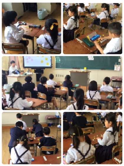 1年2組では、算数の学習をしていました。単元「どちらが多い?」の学習です。まずは、ブロックを出して、先生が出した音の数だけ並べました。最初はゆっくりだったので、どの子も余裕で聞き取っていました。「先生、もっと早くてもいいよ。」という声に答えて、音の速さが増しました。聞き逃さないよう、集中してしている様子がとてもよかったです。ウオーミングアップの学習のあと、今日の学習の内容に入っていきました。電子黒板の絵を見て、どちらが多いか考えました。みんなの学習するのが楽しそうな様子が、とてもうれしいと感じました。