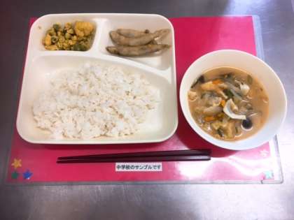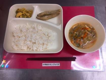 今日の給食は、【きびなごてんぷら、みそ汁、えんどうの卵とじ、ご飯、牛乳】です。えんどうの卵とじは、個別対応献立となっており、アレルギーのある児童生徒には、卵を除いて提供しています。