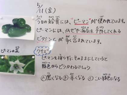5月11日(金)、今日の給食には、「ピーマン」が使われています。ピーマンには、かぜや病気を予防してくれるビタミンCが多く含まれています。