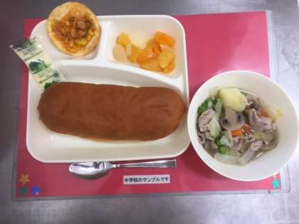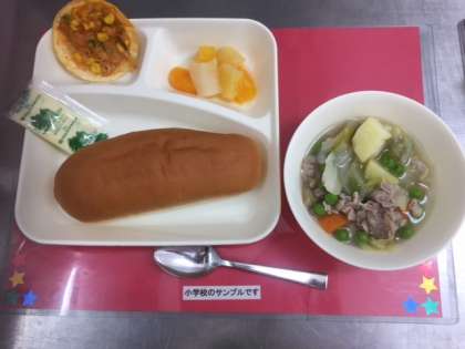 今日の給食は、小中ともに【豚肉と野菜のスープ煮、変わりピザ、ミックスフルーツ、コッペパン、マーガリン、牛乳】です。