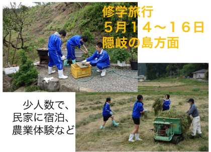 説明の前にこの間の学校の様子として、3年生の修学旅行、1年生の一泊移住を中心に写真を見ながら報告。(上の写真:説明用パワーポイントから)
